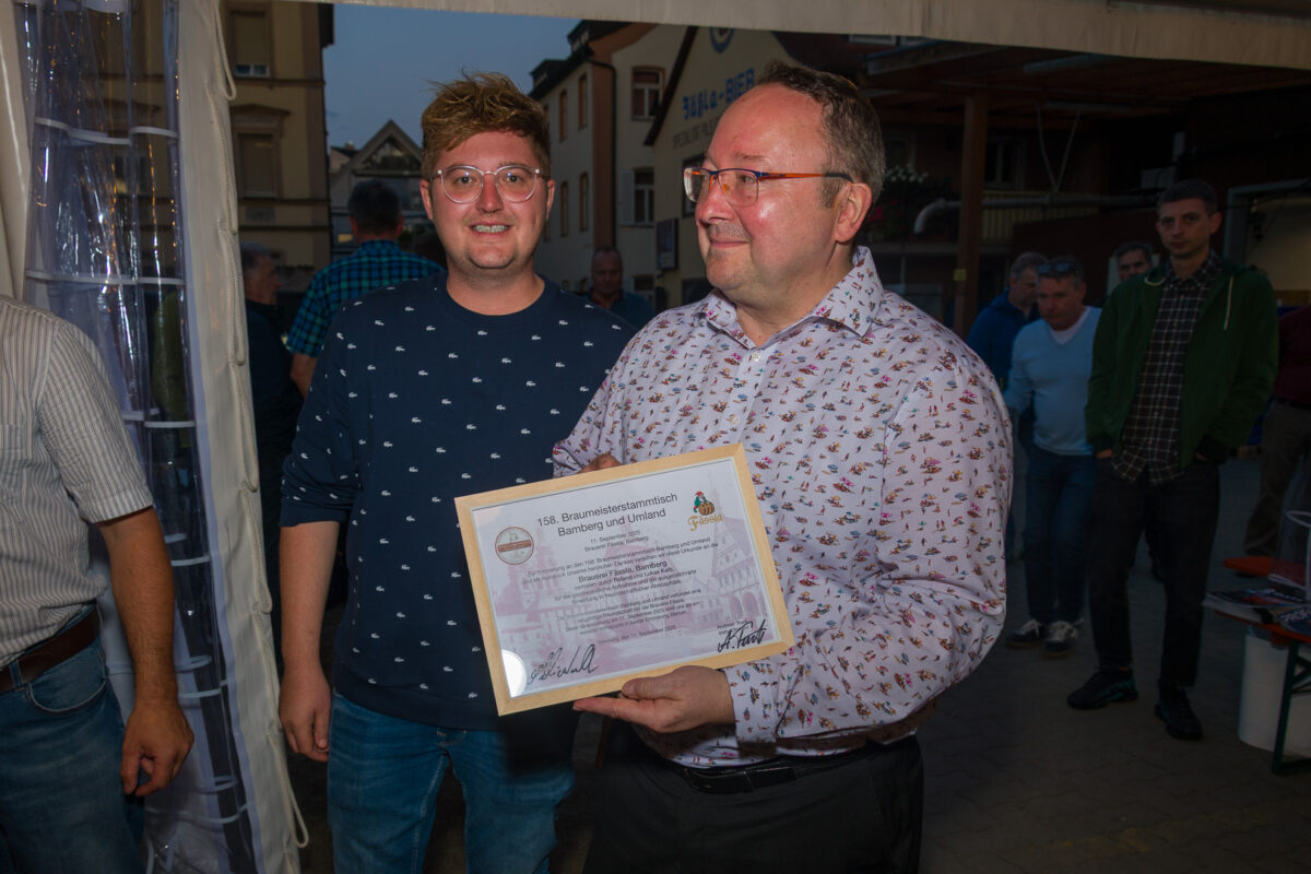 Anlass für den 158. Braumeisterstammtisch Bamberg und Umland am 11. September 2025 war die neue Abfüllanlage der Brauerei Fässla. Die Familie Kalb bereitete den zahlreichen Gästen einen der Investition würdigen Empfang: Im Hof war ein Zelt mit rund 160 Sitzplätzen aufgebaut – doch selbst das reichte nicht aus. Etwa 40 Kolleginnen und Kollegen genossen ihr Stehbier vor dem Zelt. Und auch die Brotzeit hatte Festzeltcharakter: Es gab gebratenen Ochsen.